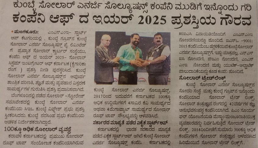 We are proud to share our joy that we are the first homegrown Solar rooftop integrator company in coastal Karnataka to receive ISO 9001:2015 certificate for Quality management, Quality solar rooftop integration and commissioning. This certificate is received by our sister concern Kumble Solar Energy Solutions Pvt.Ltd within a time frame of one year from date of incorporation. This is a small reward for our technical expertise, quality materials used, prompt service backup. Kumble solar is sister concern of Solar Trade Links and a Kumble group company.